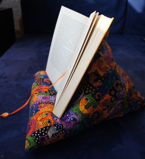 Buchkissen aus gemusterten Baumwollstoffen in Wunschfarbe, gefüllt mit Styroporkügelchen.
